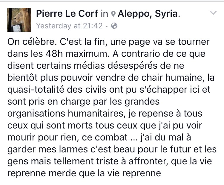 Dans la nuit de lundi à mardi, sur sa page Facebook, le jeune Pierre Le Corf (27 ans) a célébré l’entrée de l’armée de Bachar el-Assad à Alep-Est, dernier morceau de la ville tenu par les rebelles.