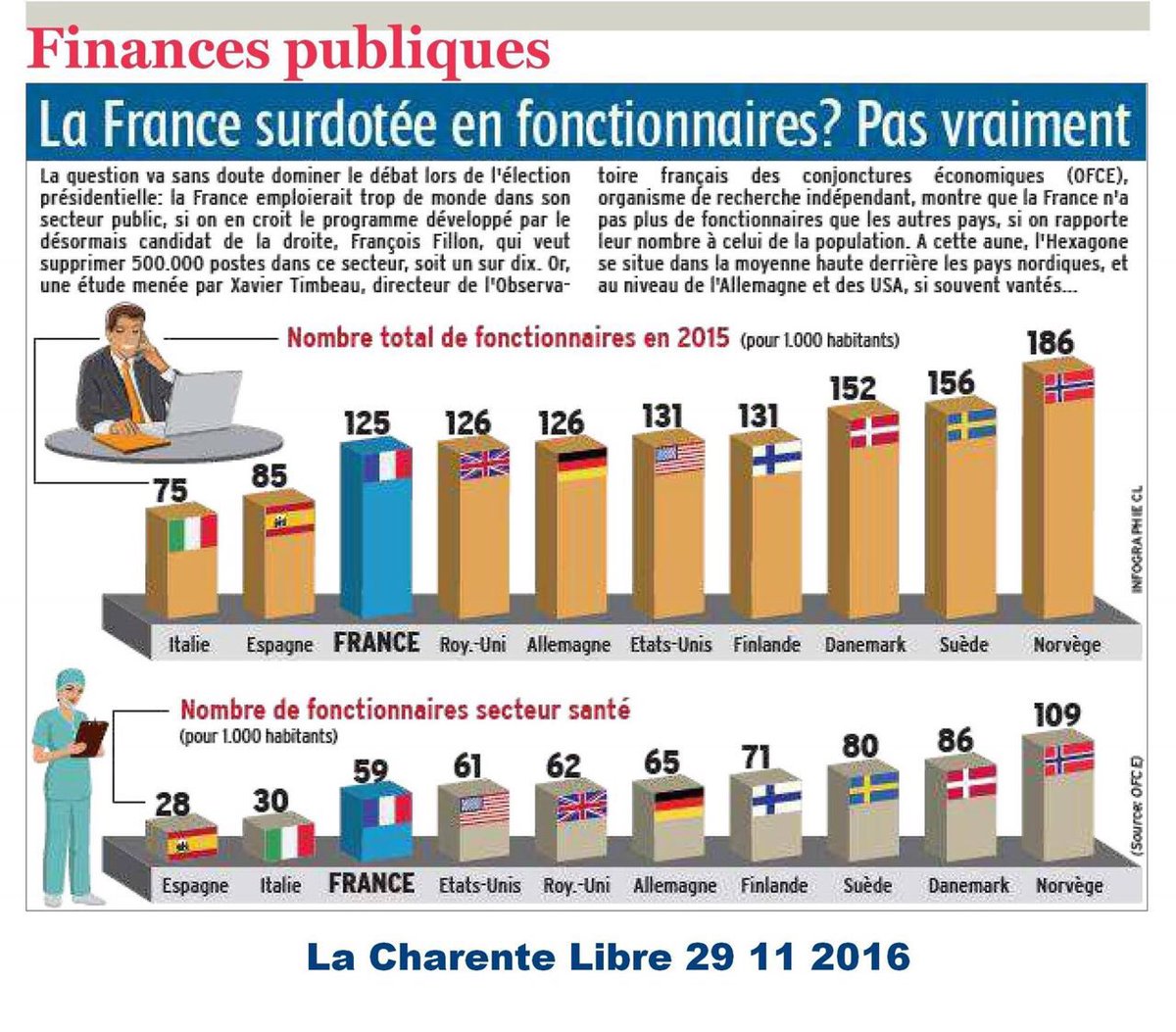 Or, une étude menée par Xavier Timbeau, directeur de l'Observatoire français des conjonctures économiques (OFCE), organisme de recherche indépendant, publiée sur le site Alterecoplus montre que la France n'a pas plus de fonctionnaires que les autres pays, si on rapporte leur nombre à celui de la population.