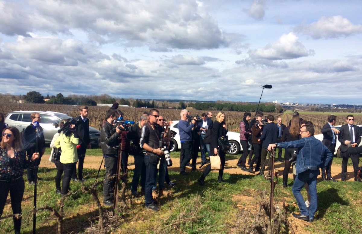 A #Nîmes, une horde de journalistes attend François #Fillon au beau milieu des vignes. Pour l'instant, pas de manifestants... @20minutesmont