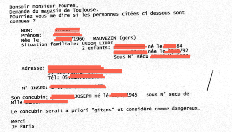 Ikea ne s’est pas privé non plus, dans le cadre de ses enquêtes très spéciales, de s’intéresser aux « concubins » de ses cibles. Un mail du 19 août 2003, toujours de Jean-François Paris, l'atteste. Il relaie cette fois une demande d’enquête du «magasin de Toulouse» visant une femme de 43 ans, Viviane D., employée depuis 1997 chez Ikea. Avec cette précision qui en dit long sur l’état d’esprit des démarches occultes entreprises : «Le concubin serait a priori “gitans” et considéré comme dangereux.»