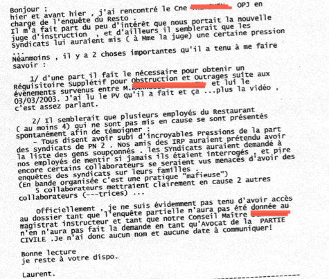 «Hier et avant hier, j’ai rencontré le commandant T., OPJ (officier de police judiciaire - ndlr) en charge de l’enquête du Resto», commence le cadre d’Ikea, un ancien gendarme, qui détaille ensuite toute la stratégie d’enquête de la juge en charge du dossier. Il affirme également avoir «lu» un procès-verbal d’audition… Le cadre d’Ikea semble avoir parfaitement conscience du caractère illégal de sa démarche, son mail se terminant par ces mots révélateurs : «Officiellement, je ne suis évidemment pas tenu d’avoir accès au dossier.»