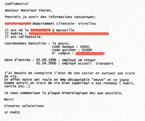 Dans ce mail, Ikea passe commande auprès de ses prestataires en barbouzeries pour une enquête visant l’un des salariés du site de Vitrolles, Gérald G. La demande formulée est claire : «J’ai besoin de connaître l’état de son casier et surtout son train de vie. En effet, notre ami roule en BMW décapotable “neuve” et ce jeune homme aurait un train de vie bien supérieur à ses revenus (habit, sortie, etc.)», écrit Jean-François Paris. Qui n’a pas donné suite à nos demandes d’entretien.